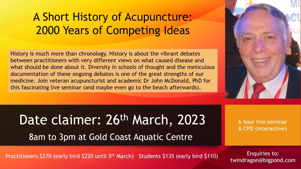The history of acupuncture is far from being a monlithic structure of rigid theories and unchanging traditions of theory and practice. Rather it is a series of lively debates about everything from needle retention times and needle techniques to what causes diseases and what should be done about it. These contests of ideas are ongoing and to develop a deeper understanding of our current debates it is useful to know where these ideas came from and how they have played out over the last 2000 years.